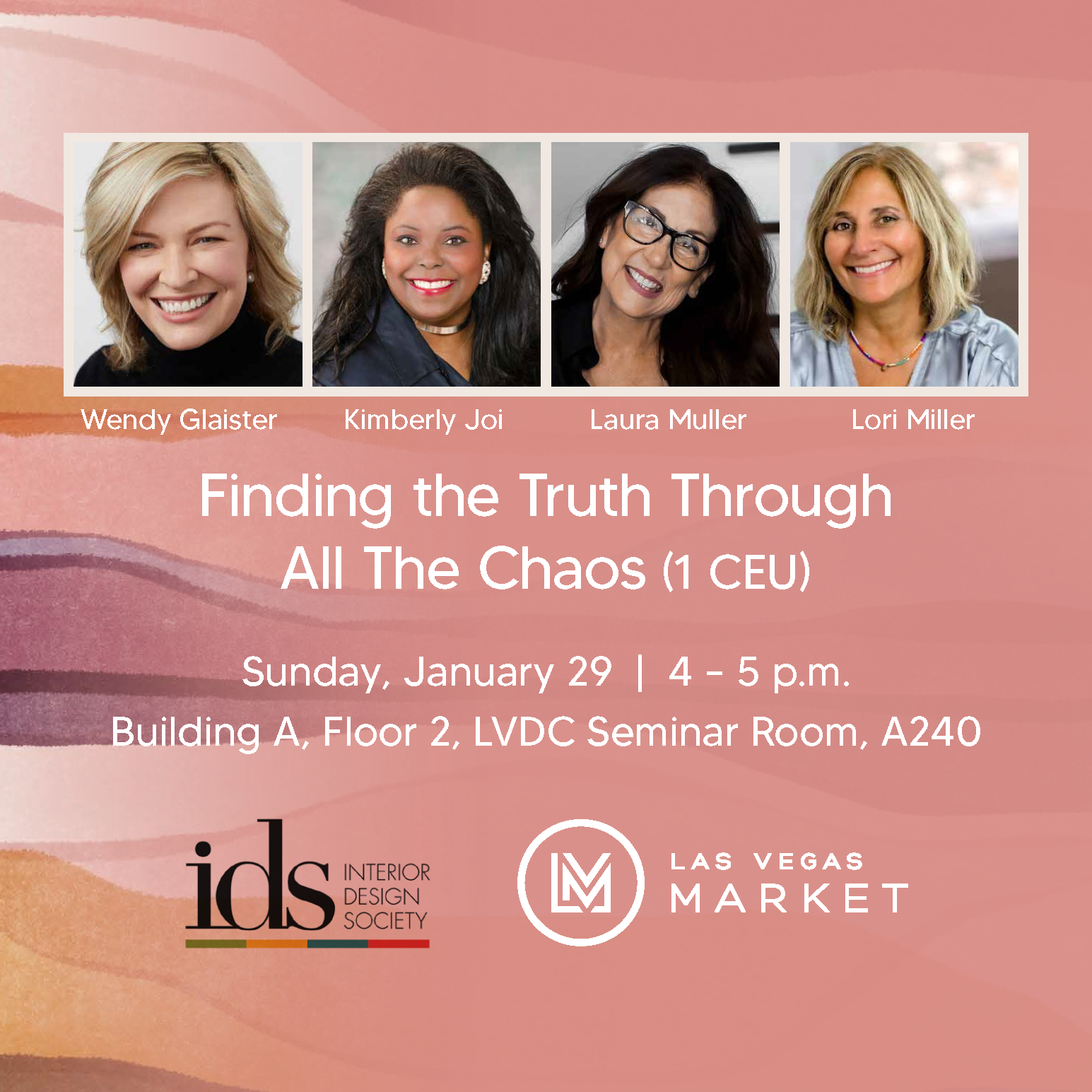 In this Casual fireside chat, hear from powerful and successful businesswomen through their shared experiences on how they have stayed true to themselves while navigating design chaos. Learn from these industry leaders how to determine your leadership style; how to stay focused & disciplined; how to foster your inspirations for a more productive and successful outcome, and more. Joining this discussion will be Wendy Glaister, Founder and Principal of Wendy Glaister Interiors; Kimberly JOI McDonald, Founder, Owner & CEO of Designing JOI, LLC; Laura Muller, Principal, Creative Direct & Interior Designer for Four Point Design Build; and moderated by Lori Miller, owner of LGC Interior Design. In partnership with Interior Design Society. (1 CEU)Sunday, January 29, 4:00pm-5:00pmĀ LVDC Seminar Room, Building A, A240 In partnership with Interior Design Society Space is limited and registration is recommended. In order to provide you the content requested, we need to store and process your personal data. We may also share your data with our authorized content providers so that you may be notified of their future service offerings directly.